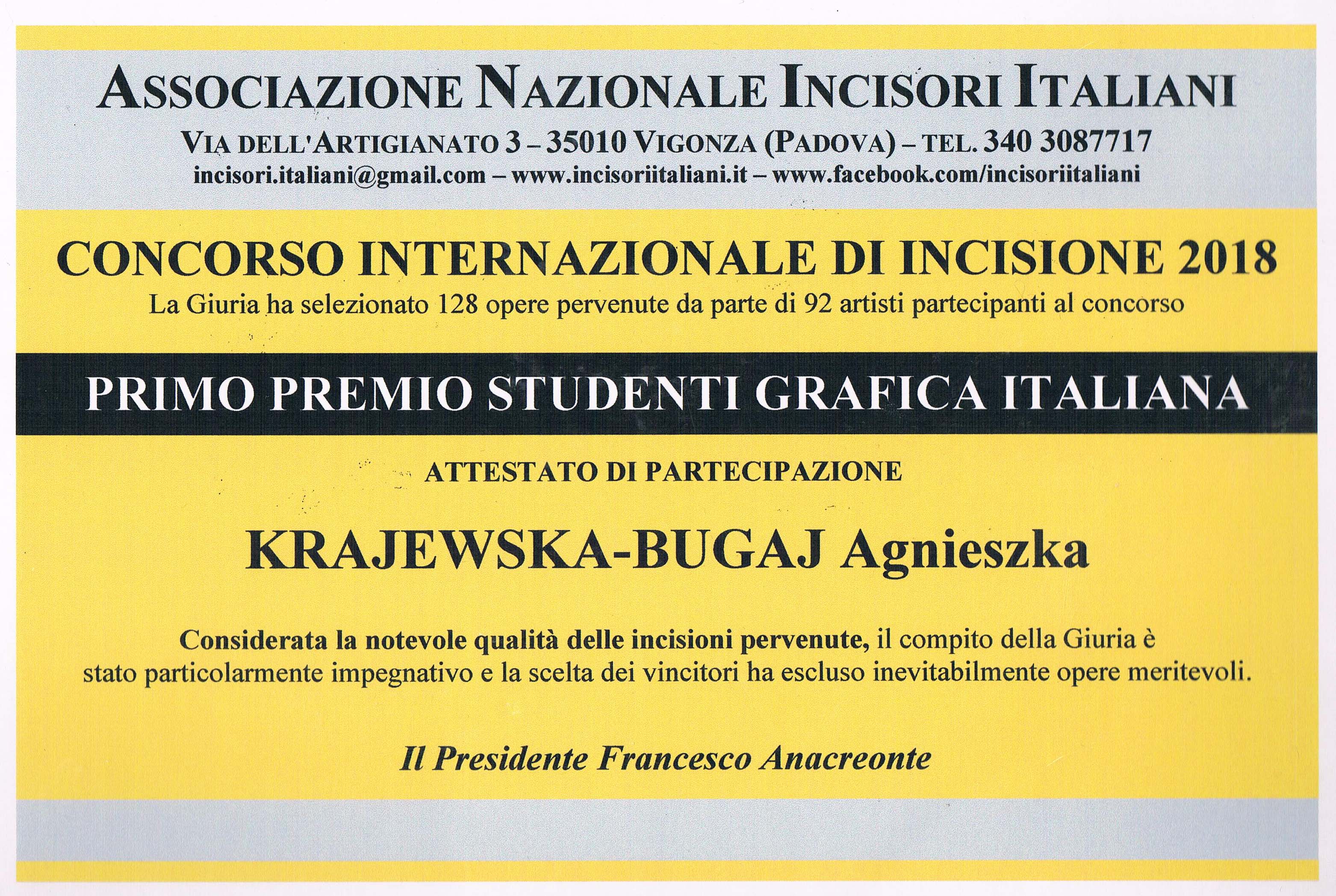 Studentki Agnieszka Krajewska-Bugaj i Anastazja Dundicz (drugi roku studiów licencjackich ISP) brały udział w pokonkursowej, międzynarodowej wystawie grafiki Zamek Da Peraga w Vigonza (Włochy).