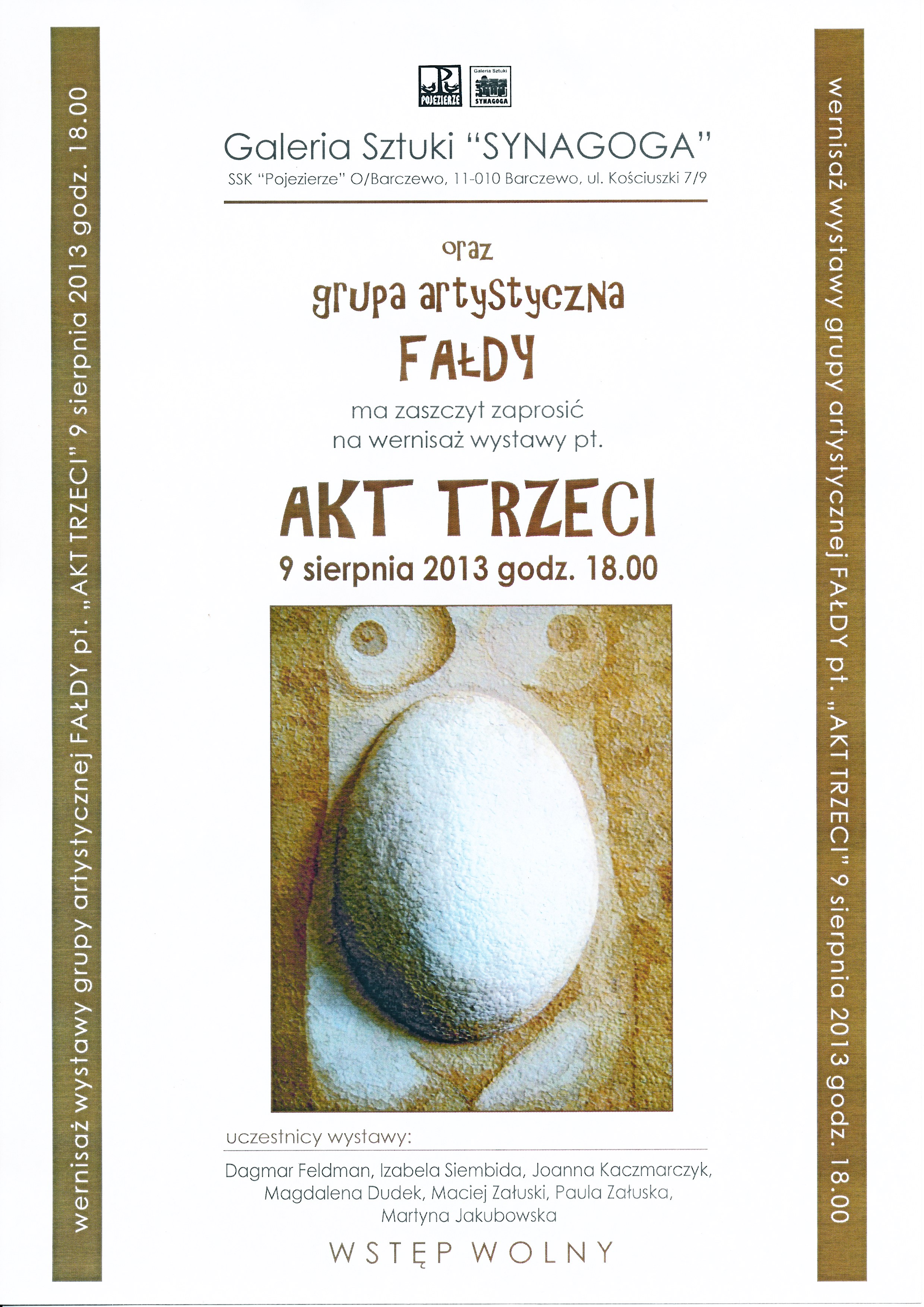 Grupa artystyczna Fałdy zaprasza 9 sierpnia o godz. 18.00 na wernisaż wystaway "Akt trzeci" do Galerii Sztuki Synagoga w Barczewie.