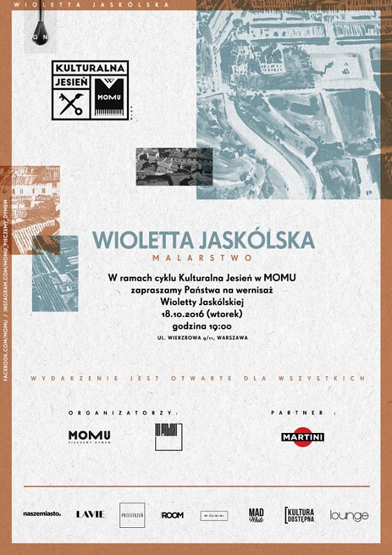 W najbliższy wtorek (18.10.2016) o godzinie 19.00 odbędzie się wernisaż wystawy prac malarki Wioletty Jaskólskiej w restauracji MOMU. Współorganizatorem jest 101 Projekt Galeria Sztuki Współczesnej. Serdecznie zapraszamy.