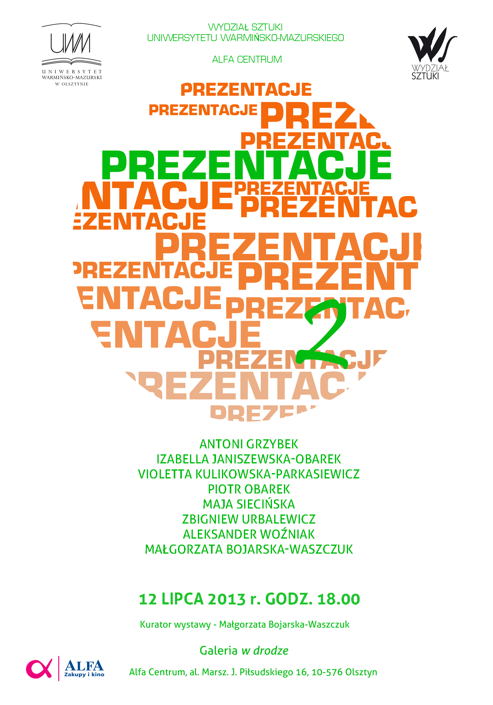W Galerii w drodze Wydziału Sztuki UWM w Alfa Centrum 12 lipca 2013 r. o godz. 18 zostanie otwarta wystawa „PREZENTACJE. Część druga." Będzie to przegląd prac artystów związanych z Instytutem Sztuk Pięknych UWM. Rysunek, grafikę, fotografię, malarstwo zaprezentują: Antoni Grzybek, Izabella Janiszewska-Obarek, Violetta Kulikowska-Parkasiewicz, Piotr Obarek, Maja Siecińska, Zbigniew Urbalewicz, Aleksander Woźniak, Małgorzata Bojarska-Waszczuk.