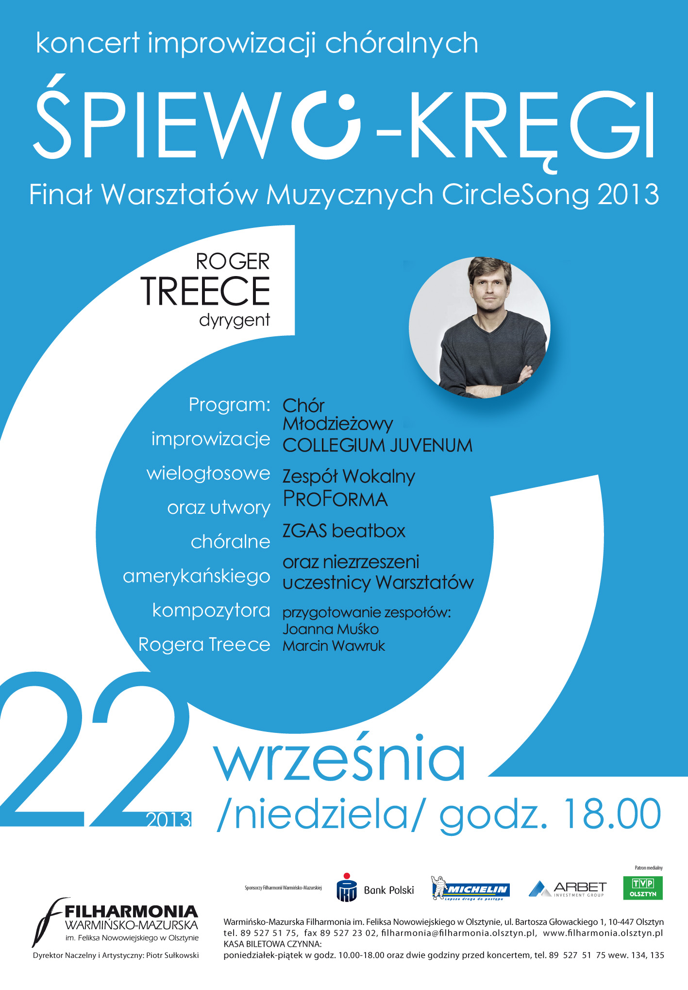 Zapraszamy na wyjątkowy koncert muzyki wokalnej, oparty na wielogłosowych improwizacjach chóru prowadzonego przez amerykańskiego kompozytora i dyrygenta Rogera Treece. Będzie to zwieńczenie Warsztatów Muzycznych „CircleSong 2013", organizowanych przez olsztyńskie zespoły chóralne „Collegium Juvenum" i „ProForma", podczas których Roger Treece przedstawi uczestnikom tajniki nowoczesnej metody improwizacji wielogłosowej CircleSong, stworzonej przez legendarnego wokalistę Bobby McFerrina. Kilka utworów chóralnych znanych z płyty VOCAbuLaries, sygnowanej przez tego artystę, znajdzie się w programie koncertu (stanowiącego w znacznej części niespodziankę również dla występujących w nim chórzystów).