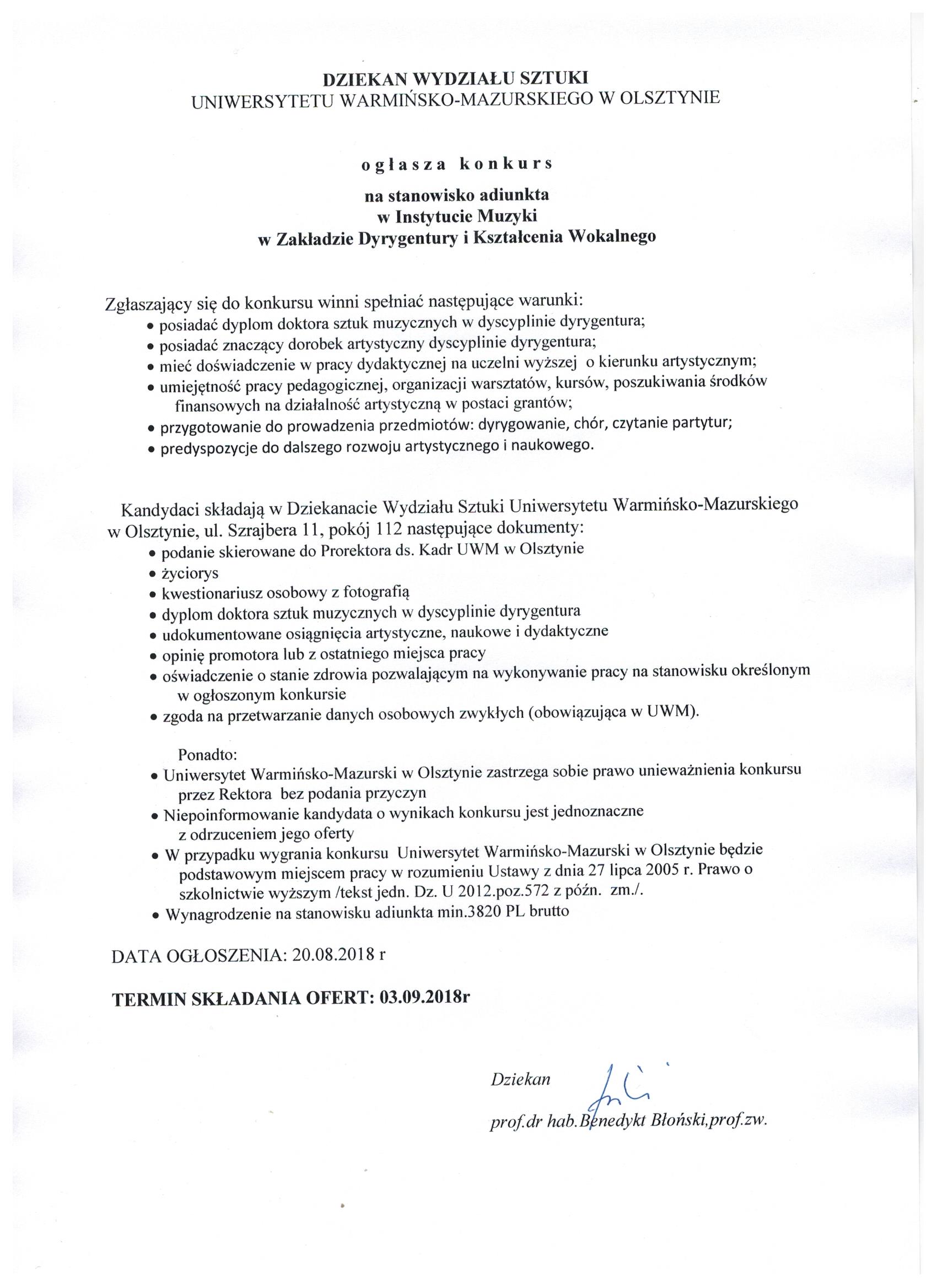 k o n k u r s na stanowisko adiunkta w Instytucie Muzyki w Zakładzie Dyrygentury i Kształcenia Wokalnego